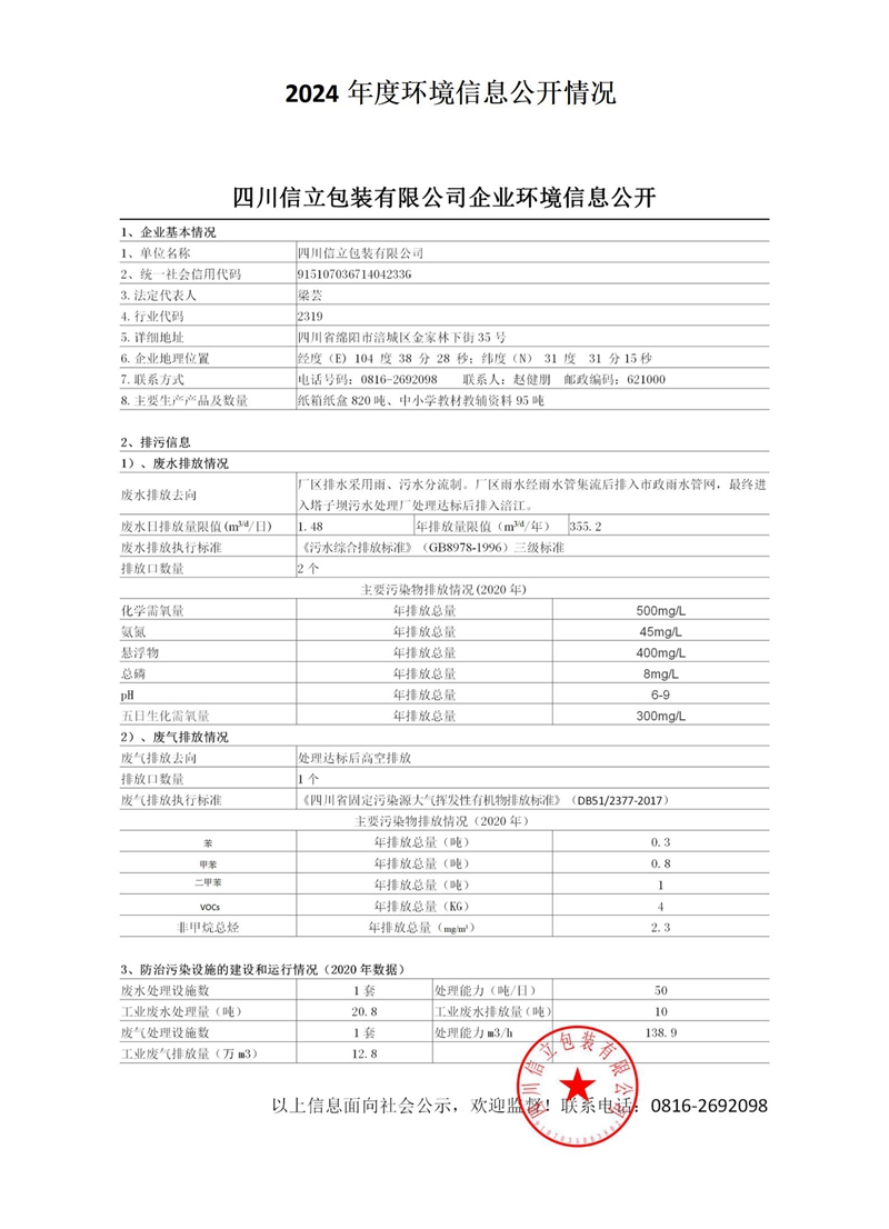 四川信立包裝有限公司企業(yè)環(huán)境信息公開